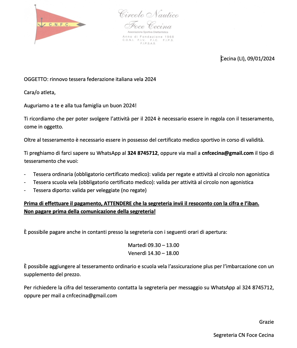 Il Circolo Nautico Foce Cecina è lieto di comunicare ai soci e a tutti i frequentatori del...